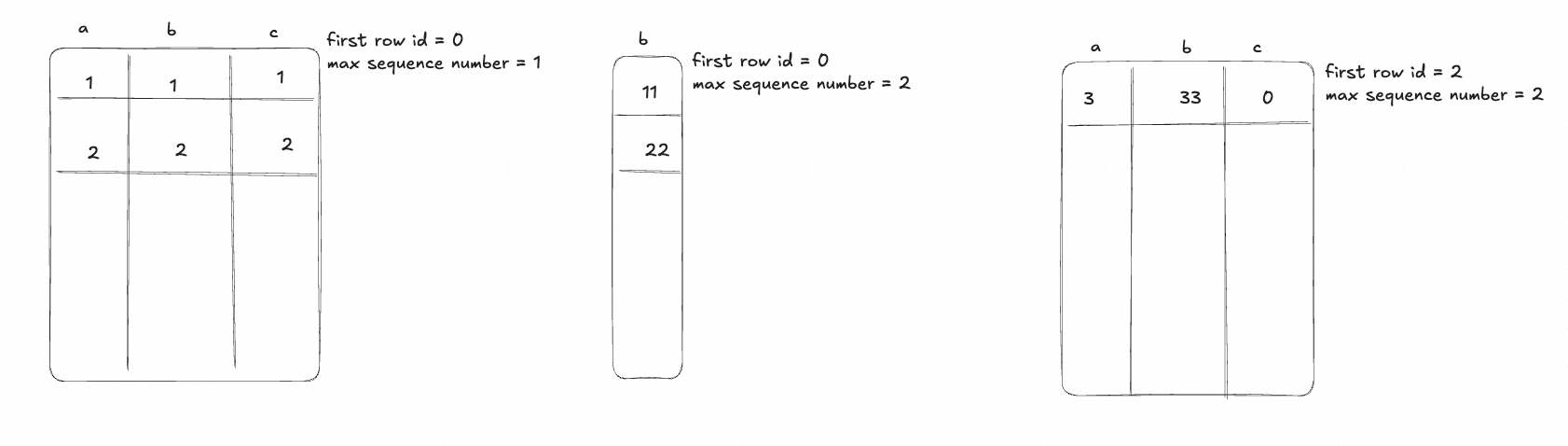 source_table. The id column and c column remain unchanged, and new records are inserted with the specified values. The difference between this and table those are not enabled with data evolution is that only the b column data is written to new files.