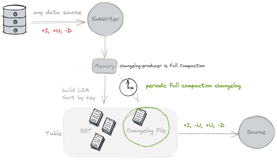 Full compaction changelog producer can produce complete changelog for any type of source. However it is not as efficient as the input changelog producer and the latency to produce changelog might be high.