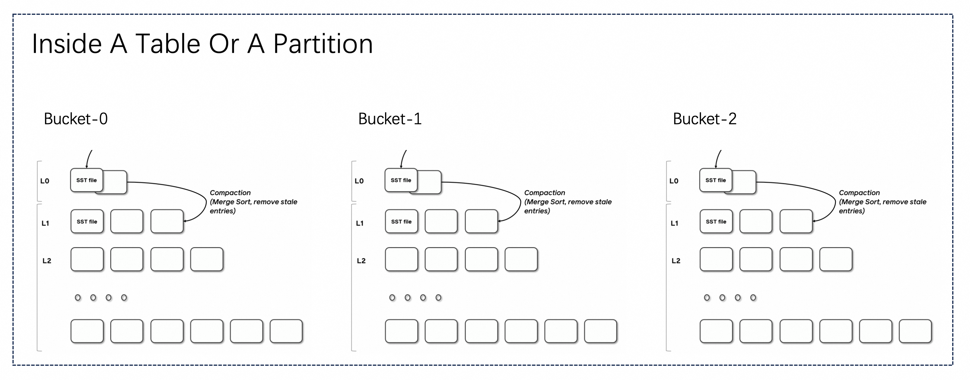 The file structure of the primary key table is roughly shown in the above figure. The table or partition contains multiple buckets, and each bucket is a separate LSM tree structure that contains multiple files.